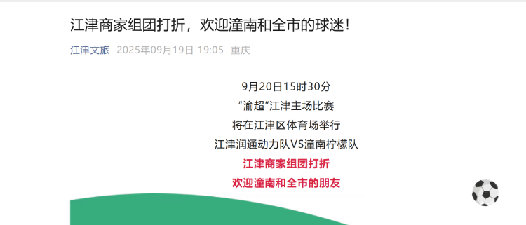 江津商家组团打折,欢迎潼南和全市的球迷朋友。江津文旅