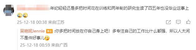 有网友在评论区留言,让吴艳妮多把时间花在训练和两年制研究生读了四五年也没毕业这件事上。12月18日,吴艳妮回复该条评论,称“你多把时间放在你自己身上吧,多专注自己的工作比什么都强,所以人太闲不是件好事儿”。