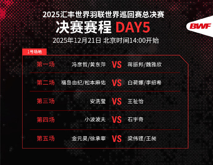 下午两点开打的首场比赛将在两对中国组合中进行,中国队也提前锁定了混双金牌。究竟是冯彦哲/黄东萍,还是蒋振邦/魏雅欣能拿下年终冠军,一起为他们加油。