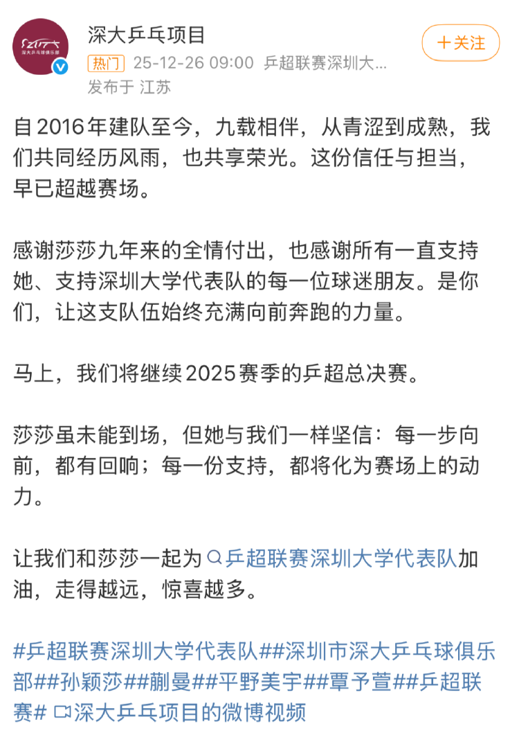 发布的视频中,孙颖莎表示:我是乒超联赛深圳大学代表队的孙颖莎,很遗憾不能来到赛场和大家并肩拼搏。在深圳大学代表队的9年里,每一次出战都是一份共同的担当与信任,这份情谊永远不会缺席,谢谢所有关心和支持我的人。最后祝深圳大学代表队取得更好的成绩,加油。