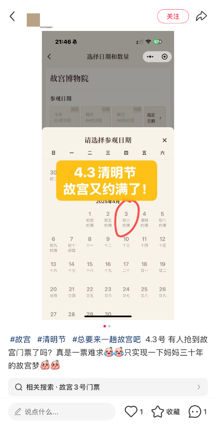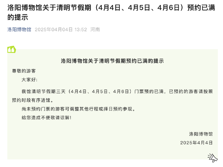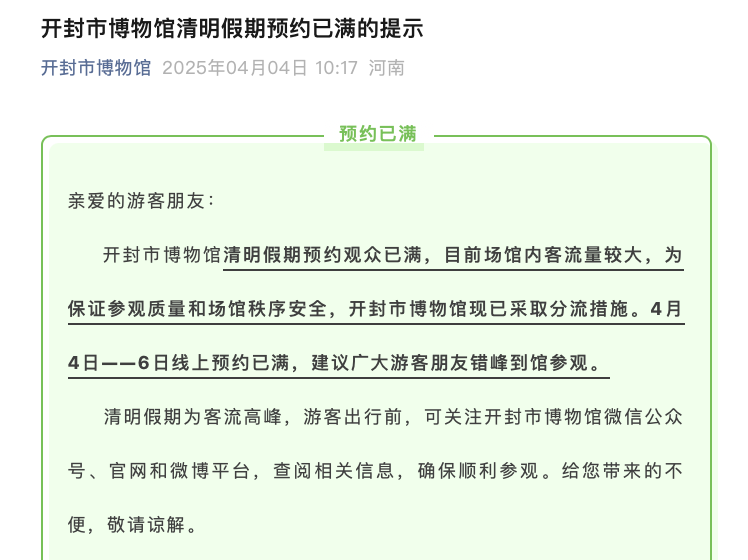 4月4日,开封市博物馆、洛阳博物馆等多家博物馆也发布通知,清明节假期三天门票预约已满。