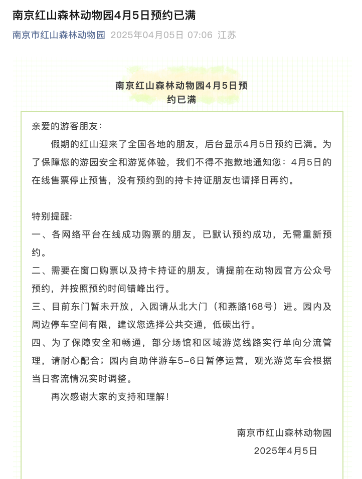 4月5日7:06,南京市红山森林动物园发布通知称,当日预约已满。“为了保障您的游园安全和游览体验,我们不得不抱歉地通知您:4月5日的在线售票停止预售,没有预约到的持卡持证朋友也请择日再约。”