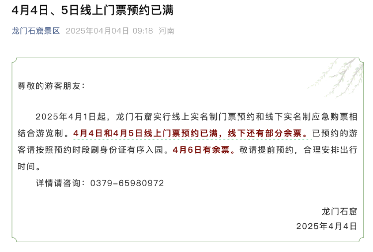 龙门石窟景区4月4日9:18就已通知“4月4日和4月5日线上门票预约已满,线下还有部分余票”。