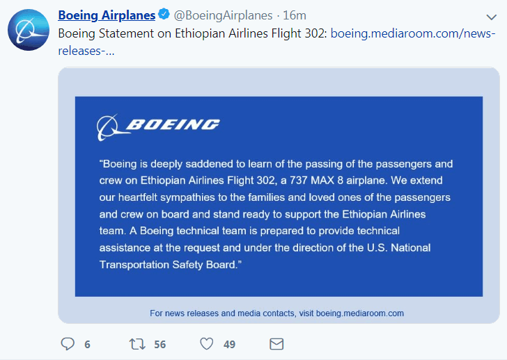 事情发生后,波音公司在其官方推特上就失事的埃塞俄比亚航空公司ET302航班发表了一份声明。声明全文如下: