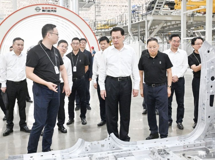 智能网联新能源汽车是我市重点打造的万亿级主导产业集群。赛力斯集团聚焦新能源汽车研发制造,行业引领带动力日益显现,目前正在加快推进位于两江协同创新区的三工厂建设,投产后将成为技术领先的智能网联新能源汽车生产基地。袁家军走进智能化生产厂房,听取项目规划建设情况介绍,询问投资量、工程进度和技术水平。在全新的汽车生产线,袁家军同技术人员交谈,了解即将下线的新车设计理念、性能和销售价格,察看产品展示。得知赛力斯多款车型受到市场热捧,企业发展蒸蒸日上、势头强劲,袁家军十分高兴,给予充分肯定。他说,重庆民营企业发展前景广阔、大有可为,希望企业抢抓机遇、再接再厉,推动技术创新,加快探索“产业大脑+智能工厂”发展路径,不断提升核心竞争力,打造行业标杆。袁家军指出,要发挥好行业龙头企业“头雁作用”,促进产业链上下游协同发展,有力带动产业集群发展。要营造良好产业生态,一体打造科创平台、产业平台和人才平台,不断激发产业发展动力活力。
