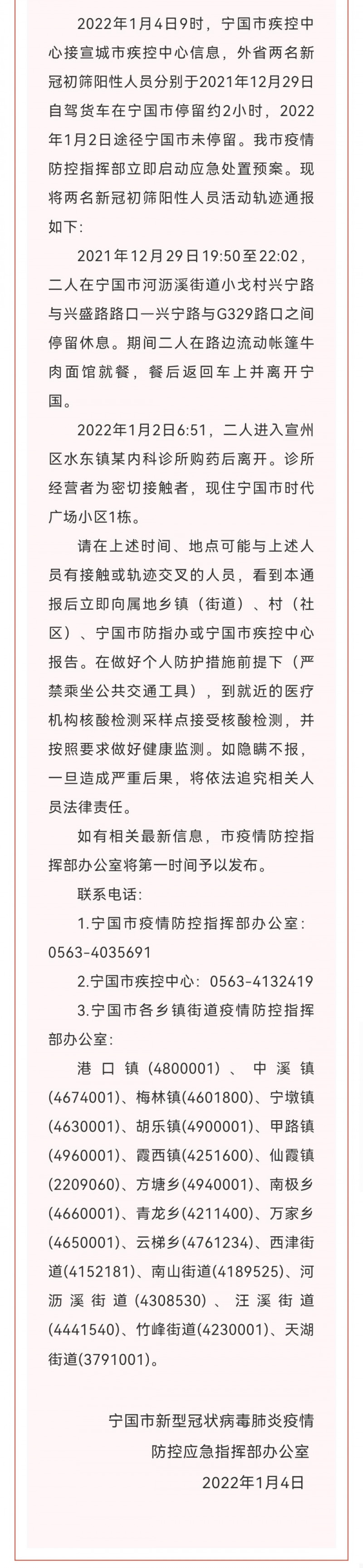 2022年1月4日,安徽宁国市新型冠状病毒肺炎疫情防控应急指挥部办公室发布情况通报。1月4日9时,宁国市疾控中心接宣城市疾控中心信息,外省两名新冠初筛阳性人员分别于2021年12月29日自驾货车在宁国市停留约2小时,2022年1月2日途经宁国市未停留。宁国市疫情防控指挥部立即启动应急处置预案。现将两名新冠初筛阳性人员活动轨迹通报如下: