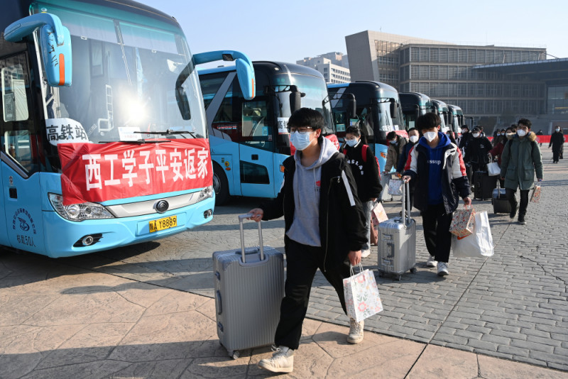 1月16日,西安工业大学的学生准备乘坐大巴车前往高铁站。新华社记者刘潇摄