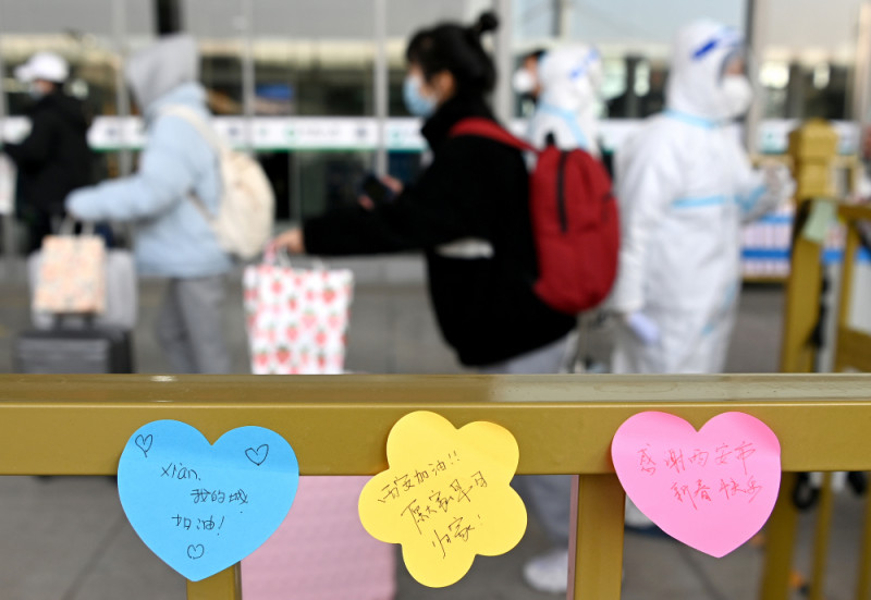 1月16日,西安北客站进站口的护栏上,留下了首批离校返家大学生的留言。新华社记者刘潇摄