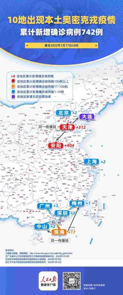据人民日报健康客户端不完全统计,其中与奥密克戎感染相关病例数量分别为:安阳累计确诊404例,天津累计确诊312例,北京2例,中山2例,珠海17例,深圳1例,梅州1例。此外,广州12月16日报告1例境外关联本土病例,上海1月13日报告2名境外输入相关联病例,辽宁大连1月12日报告2例无症状感染者。