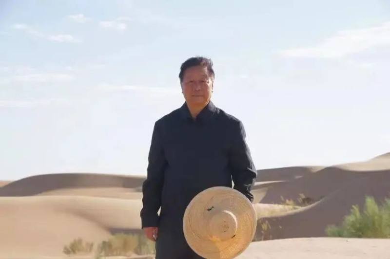 ·林占熺在内蒙古阿拉善菌草治沙基地察看农作物生长情况。