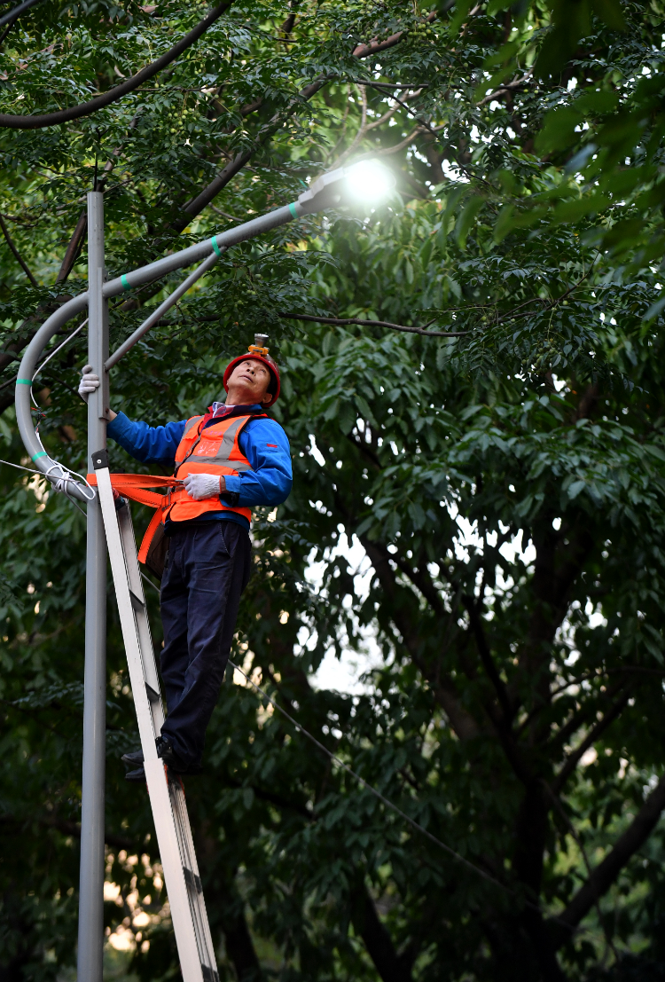 照明工人在暴雨后对路灯进行检修。