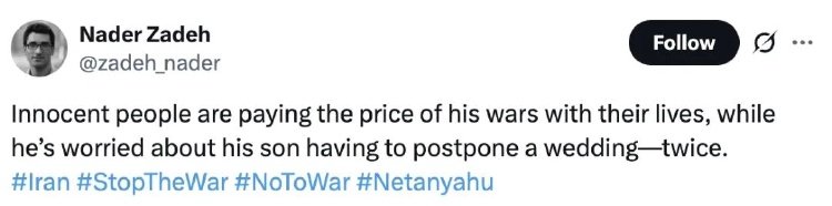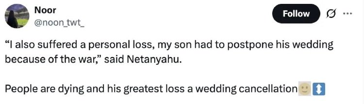 有网友称,“内塔尼亚胡说,‘我个人也遭受了损失,我儿子因为战争不得不推迟婚礼。’人们正在不断死去,而他最大的损失是婚礼被取消。”