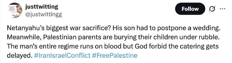有网友称,“内塔尼亚胡在战争中最大的牺牲是什么?他的儿子不得不推迟婚礼。与此同时,巴勒斯坦的父母们正将自己的孩子埋在废墟之下。他的整个政权都靠鲜血维持,但愿上帝保佑,餐饮服务不会延误。”