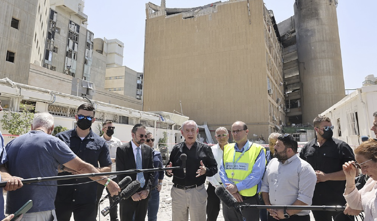 6月19日,内塔尼亚胡(中)在南部城市贝尔谢巴索罗卡医院发表讲话。图源:外媒报道配图