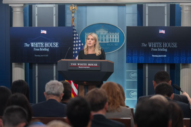 6月19日,在美国华盛顿白宫,白宫新闻秘书卡罗琳·莱维特出席记者会。新华社记者胡友松摄