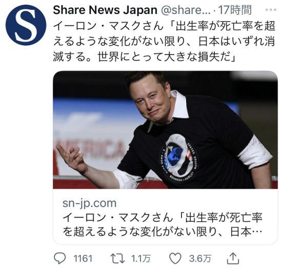 截至9日,有关马斯克言论的日语推文获得超1万次转发,3.5万次点赞