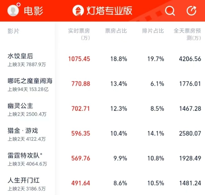 5月2日,电影五一档进入第二天,据灯塔专业版,截至5月2日上午11点30分,2025年五一档新片(含重映)总票房(含点映及预售)已突破2.7亿元,影片《水饺皇后》《猎金·游戏》《雷霆特攻队*》暂列前三。上游新闻(报料邮箱baoliaosy@163.com)记者注意到,2日的单日票房榜上,仍然继续上映的《哪吒2》(《哪吒之魔童闹海》)和经典动画《幽灵公主》也悄然杀入前三,而因巨幕播放《哪吒2》火爆全网的贵阳越界影城,五一前两日再度成为全国影院票房第一,《幽灵公主》则领跑重庆票房榜。