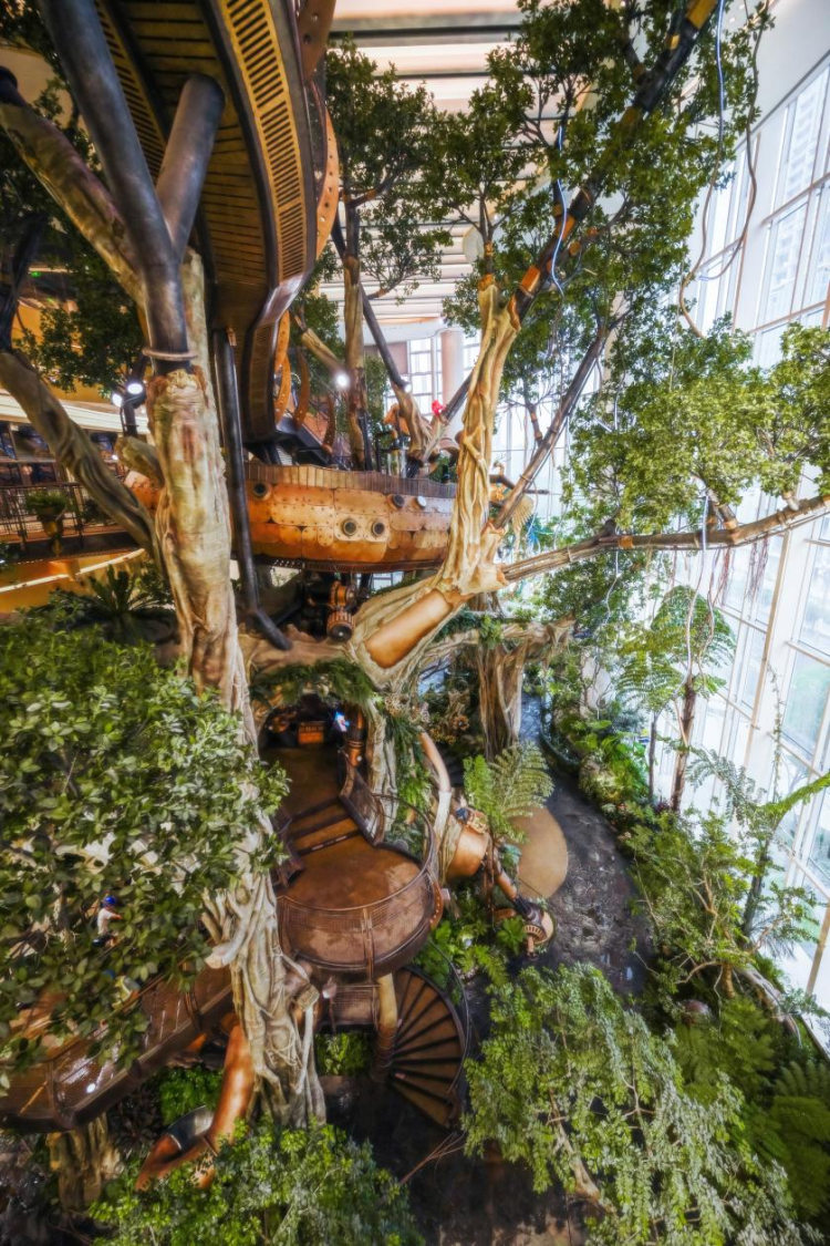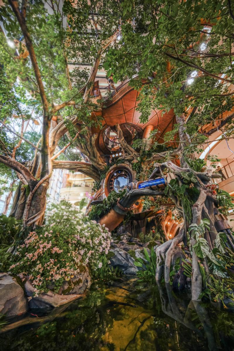 “世界树”主题空间位于项目B馆,不仅拥有超1000㎡的地面空间,还有一棵生长在空中的、拥有动态机械自动装置的参天大树,提取了奇幻的异次元世界和亚马逊热带雨林的生态景观元素,以钢筋森林为载体,营造出了具有后现代主义蒸汽朋克感的空间氛围。在此处打卡,可轻松拍出“电影大片级”的美照,和市面上其他商业及主题空间相比,形成鲜明差异,让人眼前一亮。