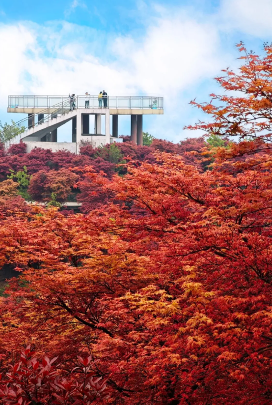 松木嘴的红枫一年中有两次变红的过程,春季已经火爆出圈,秋季经过低温洗礼再次变红,青山间一片醒目的红,从高处瞭望显得尤其壮观,此外,巴南的丰盛彩色森林、五洲园、南湖多彩植物园等也是赏秋人气去处!