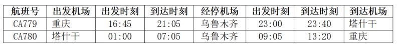 由于航程较远,旅客从重庆出发后,经乌鲁木齐可以进行短暂的休息,然后继续飞抵塔什干,具体航班计划如下: