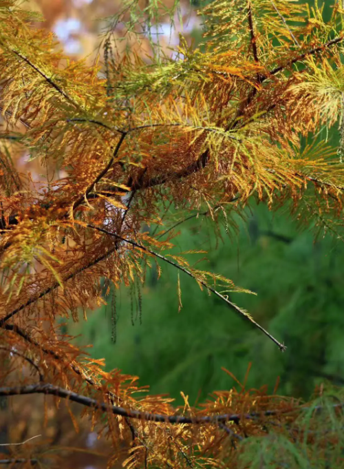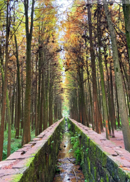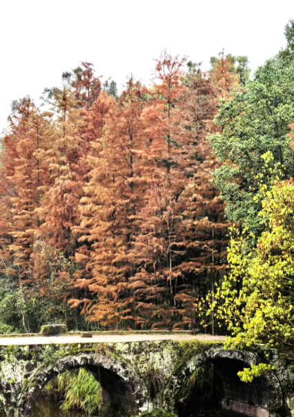 一排排水杉树披上了“红褐色”的外衣,搭配石桥、流水、水杉林,随手一拍,都是一张治愈系大片。