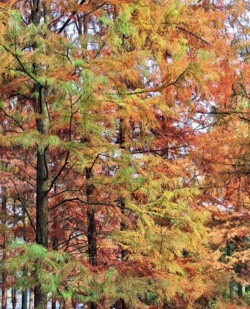 从空中俯瞰,水杉、池杉和落羽杉等整齐排列,茂盛的枝叶连接成片,好似镶嵌在长江边的“红宝石”,如果银杏未落,还能看到红黄相间的美景。