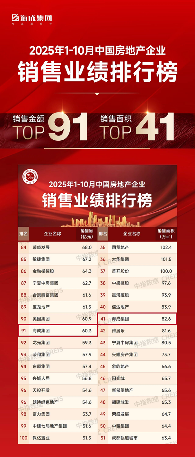 中指研究院发布的《2025年1-10月全国房地产企业销售业绩排行榜》中,海成集团荣登金榜,以实力表现跻身全国房企销售金额TOP91,销售面积TOP41,强大的市场去化能力与资金实力为其持续获取优质土储提供了坚实保障。从滨江资源到核心板块,海成集团的每一次落子均精准契合城市发展脉络,展现出对重庆未来价值的深刻洞察与长期承诺。