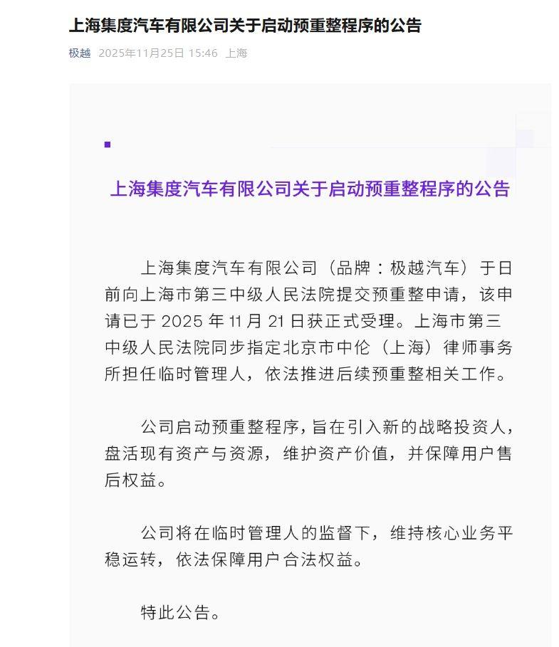 日前,极越汽车官微发布“上海集度汽车有限公司关于启动预重整程序的公告”,宣布上海集度汽车有限公司(品牌为极越汽车)启动预重整程序,旨在引入新的战略投资人,盘活现有资产与资源,维护资产价值,并保障用户售后权益。
