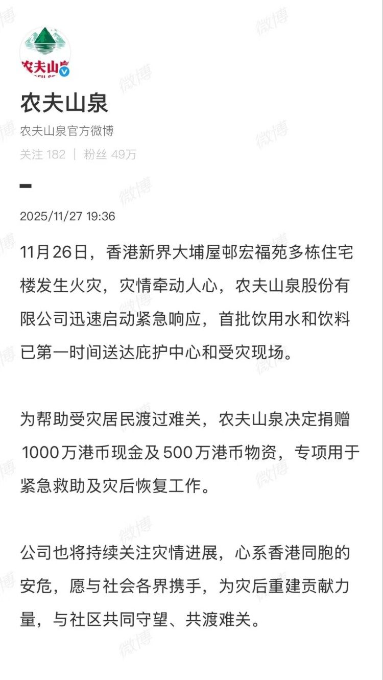 农夫山泉紧急驰援香港大埔火灾灾区,共筑爱心防线