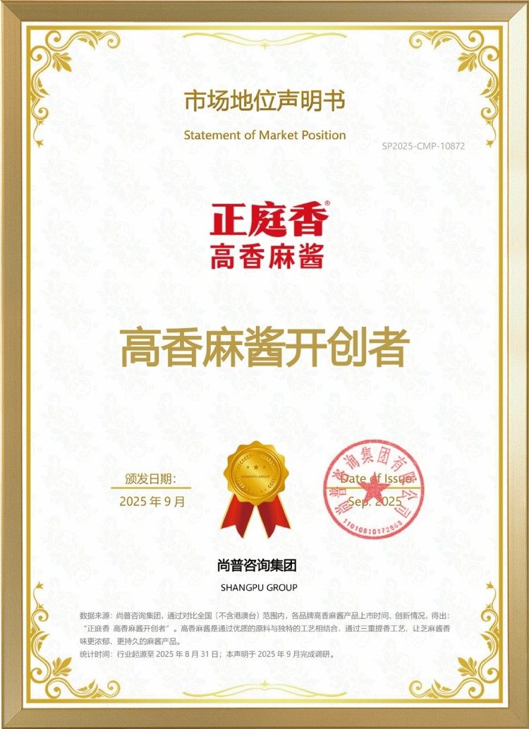 近日,国内麻酱行业传来重磅消息——正庭香高香麻酱正式斩获“高香麻酱开创者”市场地位认证。这一认证由权威机构尚普咨询集团严苛评定,通过比对全国(不含港澳台)范围内各品牌高香麻酱的上市时间、创新情况等核心维度,最终确定正庭香高香麻酱为唯一获证品牌。