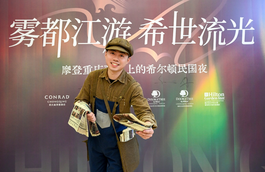 登上邮轮,宾客仿佛踏入一场老重庆的时光剧场。复古服饰的“报童”派发《希尔顿快报》,作为别具匠心的“时代见面礼”。