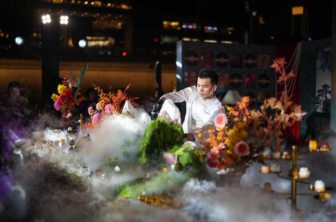 随后,由重庆康莱德酒店团队呈现的“雾锁山城·甜境重庆”甜品秀,在雾影与灯光的交织间,带来视觉与味觉的双重惊喜。