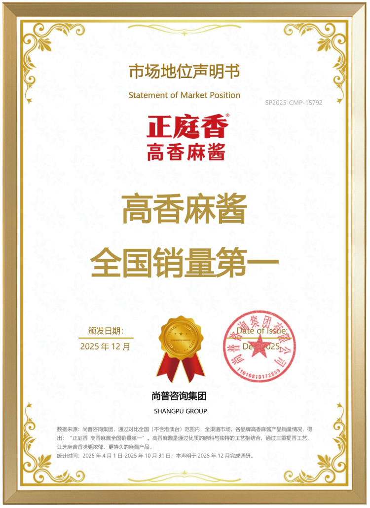 近日,正庭香高香麻酱获得“全国销量第一”市场地位认证。该认证由权威调研机构尚普咨询集团严苛评定,通过对比全国(不含港澳台)范围内,全渠道市场,各品牌高香麻酱产品销售情况,最终确认正庭香高香麻酱全国销量第一。