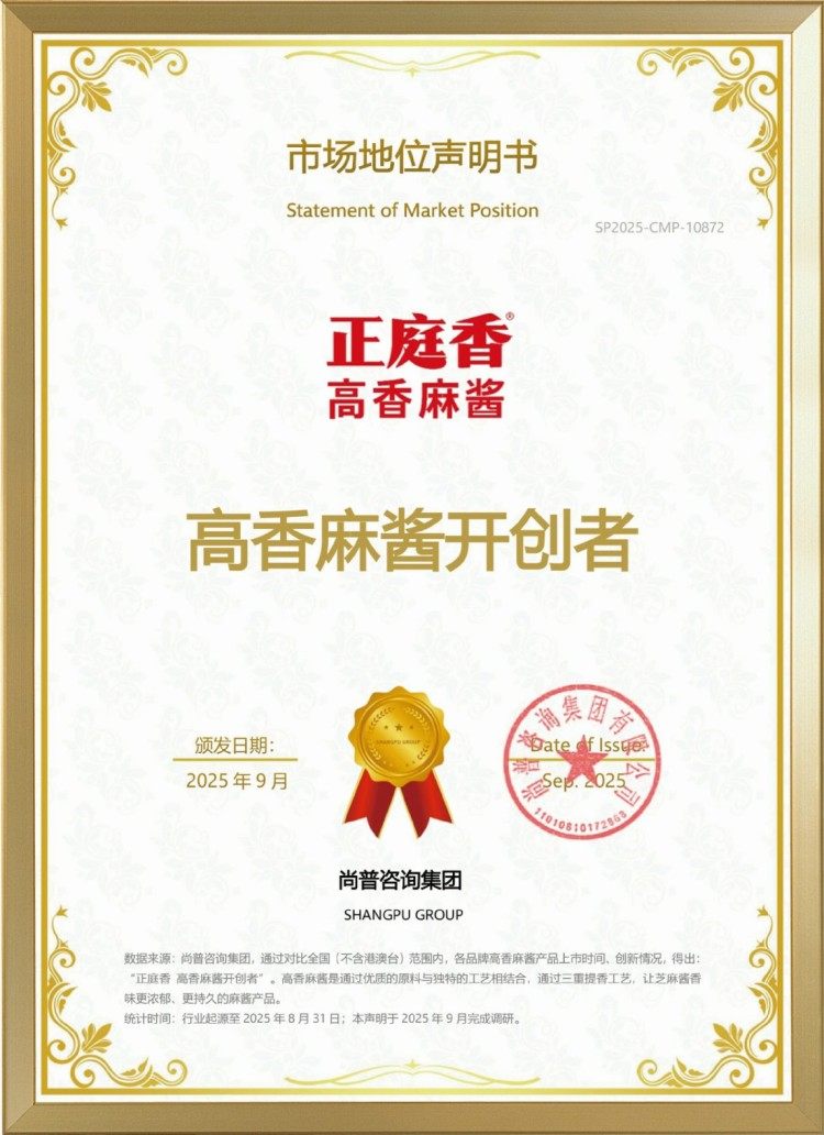 麻酱,作为中式调味品体系中的核心品类,其风味层级界定与品质评判标准长期以来处于行业模糊地带。正庭香高香麻酱的崛起,正是源于对这一领域的深度洞察与精准切入。通过工艺革新,正庭香高香麻酱成功实现相较普通麻酱提香30%,不仅重构了麻酱香气标准,更开创性地打造出“高香麻酱”这一全新赛道。2025年9月,经尚普咨询集团市场调研认证,正庭香高香麻酱荣获“高香麻酱开创者”唯一获证品牌。