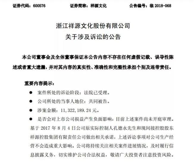 2018年9月,祥源文化发布公告称,6月份以来,公司陆续收到法院《应诉通知书》,涉及96起证券虚假陈述责任纠纷案件,诉讼金额共计人民币1132万元。已有440位投资者起诉公司,总计索赔5584.77万元,其中部分案件的被告还包括赵薇、龙薇传媒、孔德永等人。