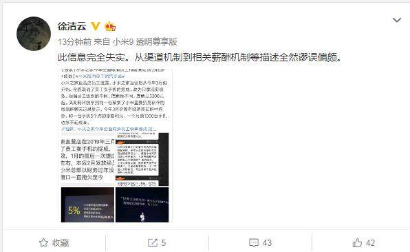 昨日,有媒体报道称小米之家今年全面取消员工销售提成。小米集团公关部总经理徐洁云在微博回应称,此信息完全失实。从渠道机制到相关薪酬机制等描述全然谬误偏颇。