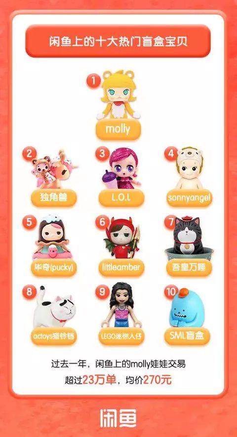 闲鱼上交易最热门的十大盲盒产品分别是:Molly、独角兽、L.O.L、sonyangle、毕奇、littleamber、吾皇万睡、actoys猫铃铛、lego迷你人仔、sml盲盒。其中,泡泡玛特出品的Molly成为名副其实的盲盒代表,过去一年,闲鱼上的Molly娃娃交易超过23万单,均价270元。