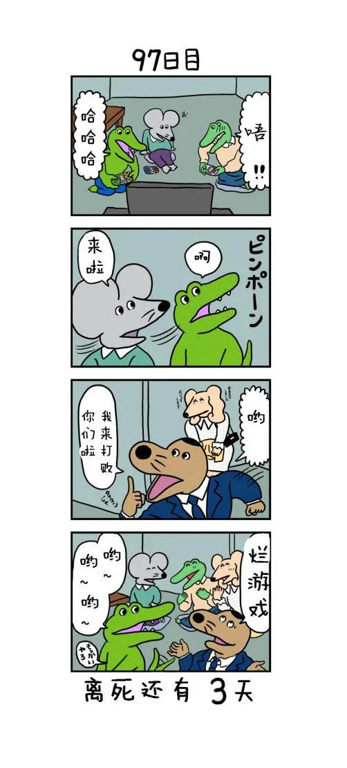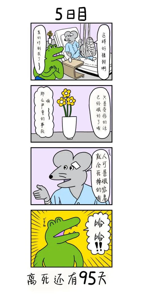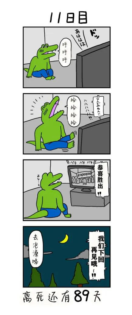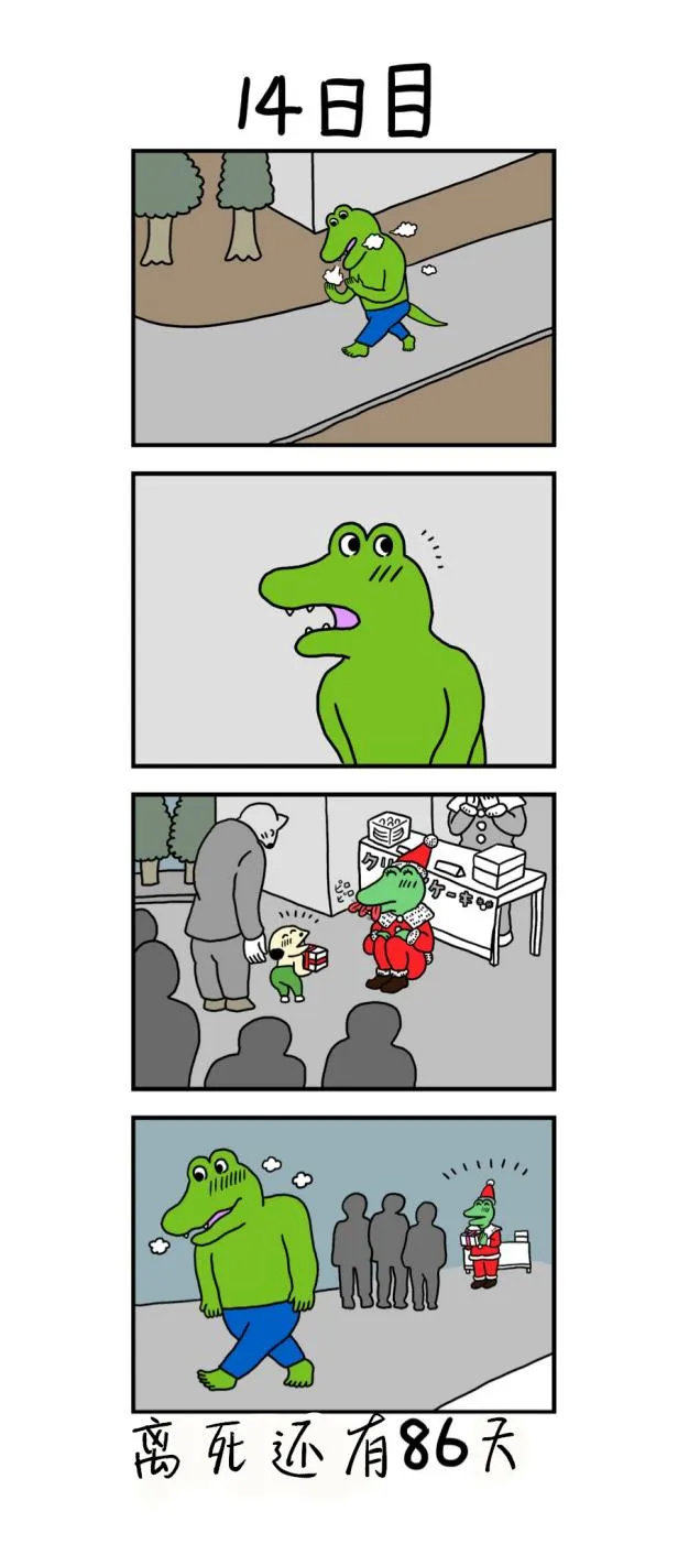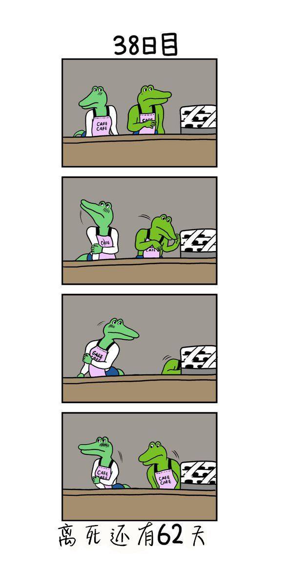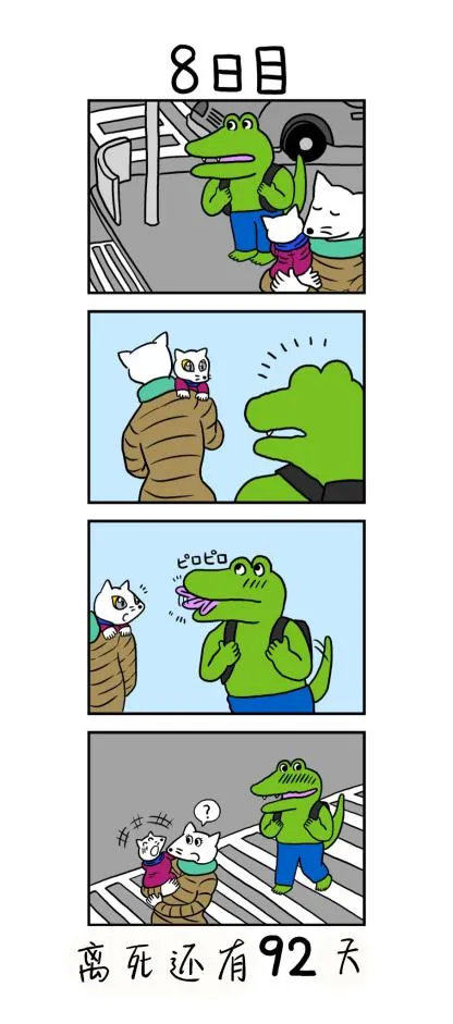 第一话中,看着电视的鳄鱼肆无忌惮地笑出声,简笔画式的画风让他更加充满傻气。仅仅看这四格漫画的内容,读者无疑会认为这是一个儿童向作品。但漫画末尾所带的“生命倒计时”,却让轻松的氛围反而凸显出了沉重。