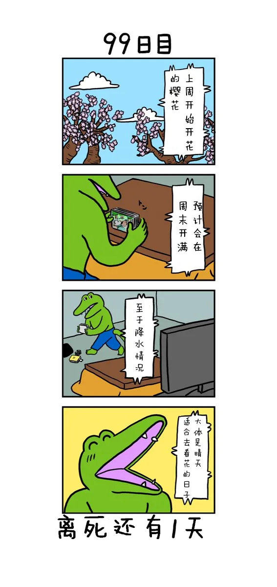 《100天后就会死的鳄鱼》讲述了一只即将在100天后,也就是2020年3月20日死去的鳄鱼生前最后100天的故事。而最新漫画里鳄鱼也确实死了,死去的原因是在公路上为救一只小鸭子而遭遇了交通事故。约定好一起去看樱花的朋友给他发来了聚会的照片,他看到了,但是回复留在手机里没有发出去……