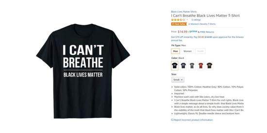 在新奇服装类别中,印有“我不能呼吸”标语的两款T恤衫登上了畅销商品前10。一款印有“黑人的命也是命”的T恤在畅销榜上的排名从上周五的1000名之外升至第60位。