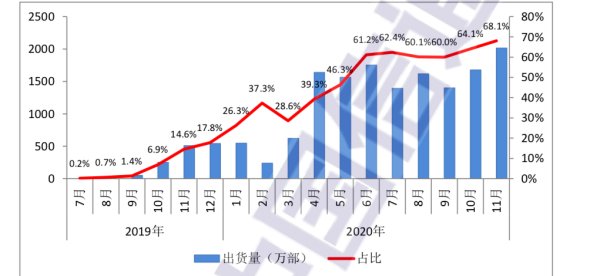 从5G手机发展情况来看,2020年11月,国内市场5G手机出货量2013.6万部,占同期手机出货量的68.1%。上市新机型16款,占同期手机上市新机型数量的53.3%。