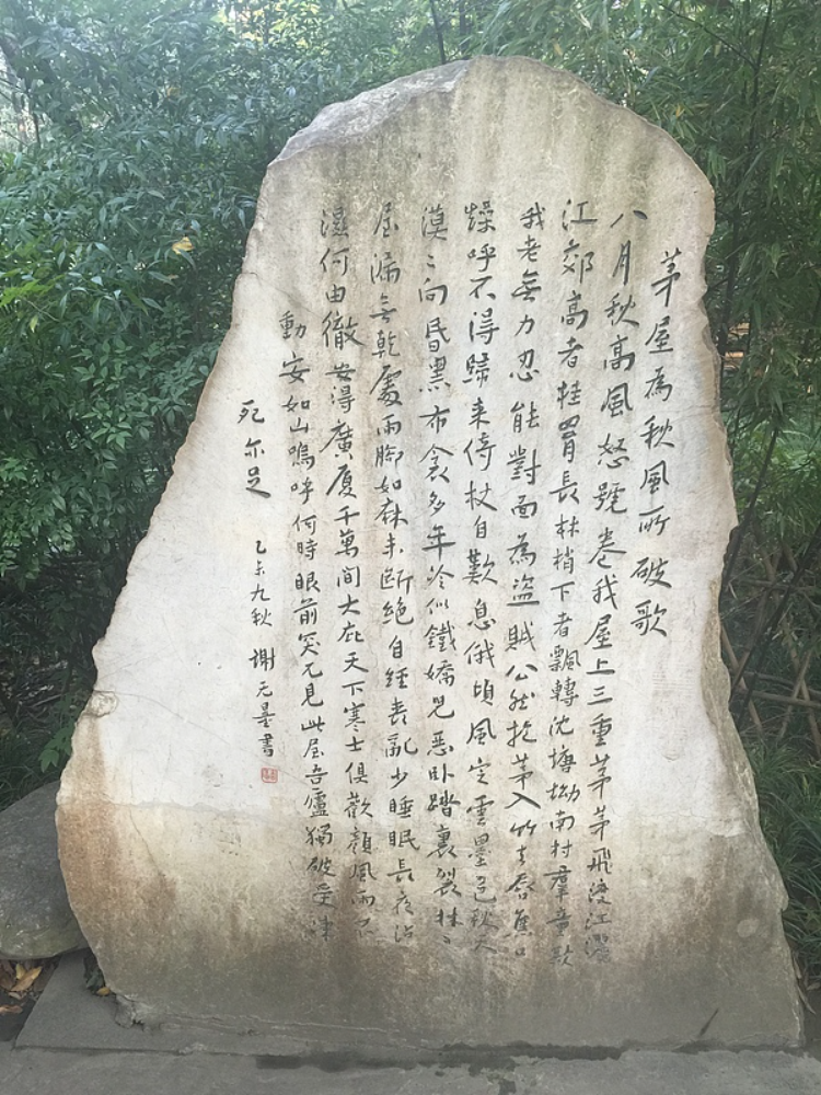 有一次秋风肆虐,掀飞了草堂屋顶的白茅。风雨交加的夜晚,盖了多年的被子冰冷如铁,室内漏雨没有一处干爽之地,孩子们也无法安睡,在这难眠长夜,诗人发出了响彻千古的呐喊:“安得广厦千万间,大庇天下寒士俱欢颜,风雨不动安如山。”这是诗人最博大的情怀,他所挂所念、所思所想,不只是自己和家人,更是天下寒士、广大人民。假使能让天下百姓都有安居之所,我一人草庐独破、受冻而死又有何妨。这才是杜诗的精神所在,也是杜甫草堂的灵魂所在。
