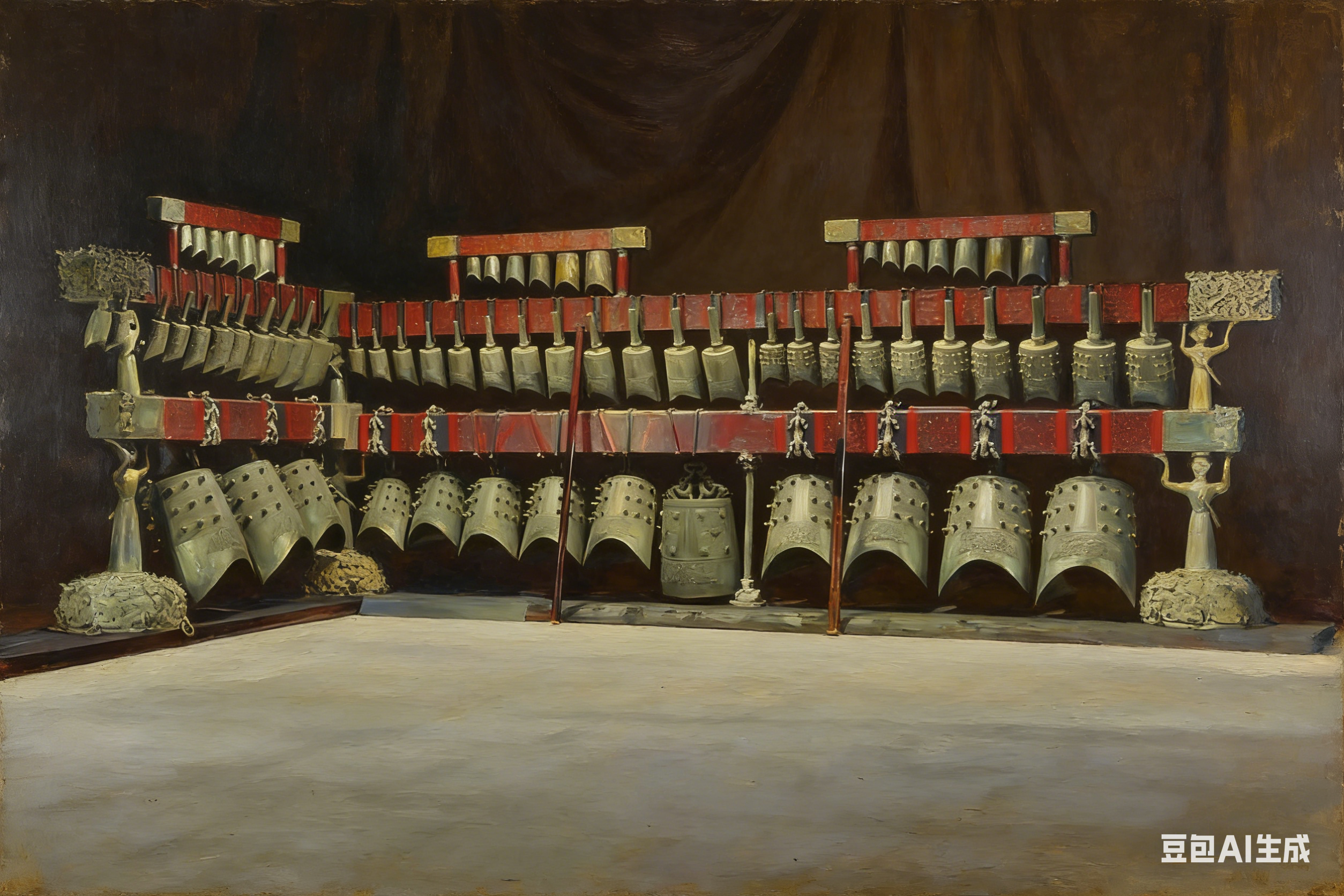 ▲曾侯乙墓出土编钟(图像由AI辅助生成)