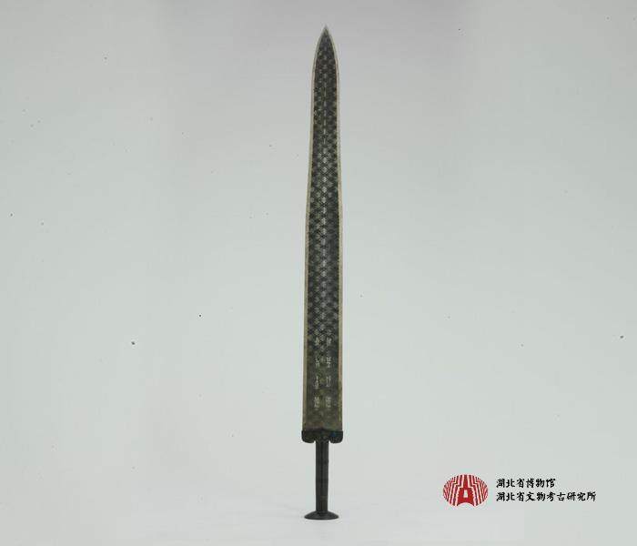 在已出土的“吴戈越剑”中,越王勾践剑是其中的佼佼者。越王勾践剑于1965年12月出土于江陵望山楚墓,剑出土时,装在黑色漆木剑鞘内,剑与鞘吻合较紧,剑身毫无锈蚀。剑全长55.6厘米,剑格宽5厘米,剑身满饰黑色菱形几何暗花纹,剑格正面和反面还分别用蓝色琉璃和绿松石镶嵌成美丽的纹饰,剑柄以丝线缠缚,剑首向外翻卷作圆箍形,内铸有极其精细的11道同心圆圈。剑身一面近格处有鸟篆铭文两行8字:越王勾践自作用剑。