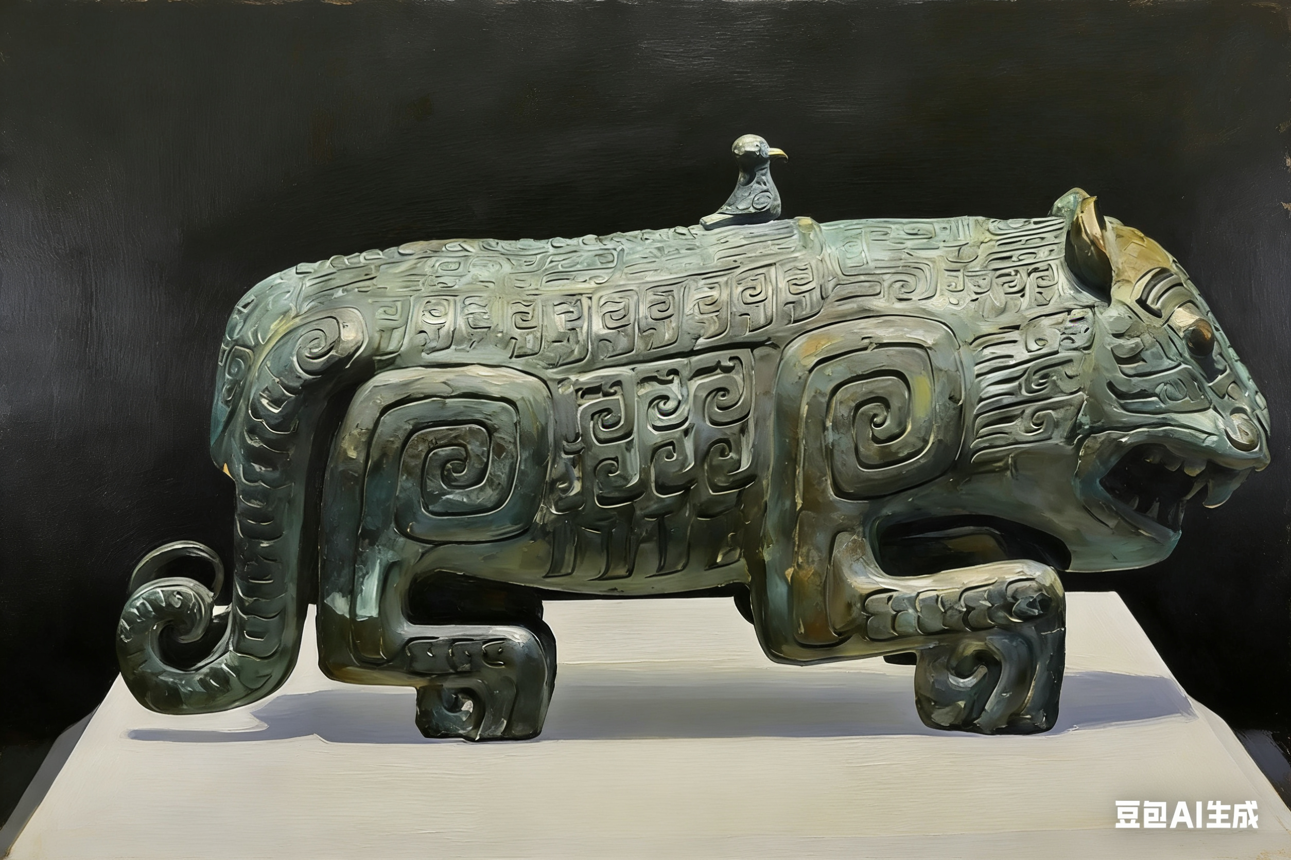 ▲江西新干大墓出土的商代伏鸟双尾青铜虎(图像由AI辅助生成)