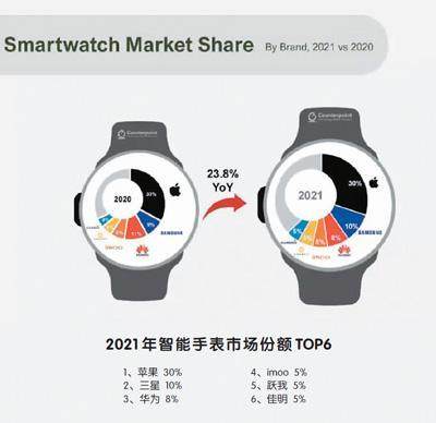 时下,智能手表正出现在越来越多中国年轻人的手腕上。据市场研究机构Counterpoint Research数据显示,2021年全球智能手表市场达到1.275亿部,比去年增长23.8%,而中国是全球仅次于北美的第二大区域市场,且增长迅速。