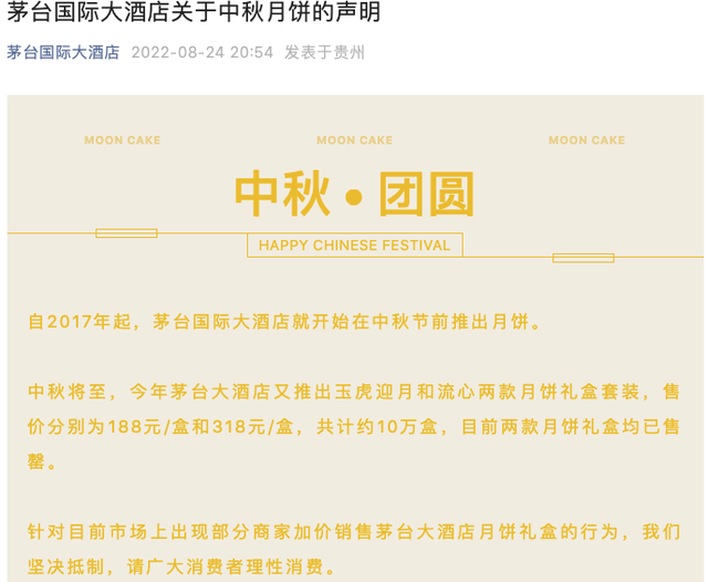 8月24日晚间,针对目前市场上出现部分商家加价销售茅台月饼的现象,茅台国际大酒店发布了声明。