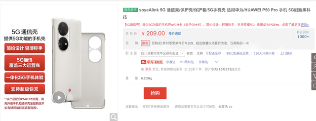 17日上午,红星资本局在华为京东官方旗舰店看到,适用于华为P50 Pro手机的5G通信壳价格的确有下降,目前为209元,而6月上市时售价为799元,4个月内价格下降了590元。