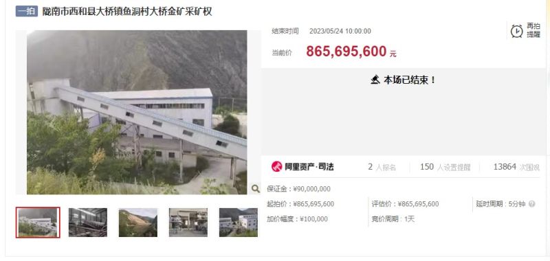 2023年5月23日到5月24日,甘肃省兰州市中级人民法院在淘宝网司法拍卖网络平台上,对甘肃省陇南市西和县大桥镇鱼洞村大桥金矿(大桥金矿)采矿权进行拍卖,起拍价8.6569亿元,2名买家报名入场,最终甘肃金舜矿业有限责任公司(甘肃金舜矿业)一次应价,以起拍价拿下。