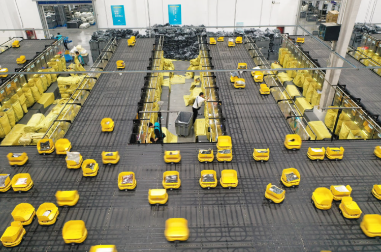 11月7日,浙江省湖州市德清县乾元镇第一产业智慧物流园区快鱼服饰有限公司华东物流中心,800余台分拣“小黄人”机器人在精准配送各类服饰(无人机照片)。新华社发(倪立芳摄)